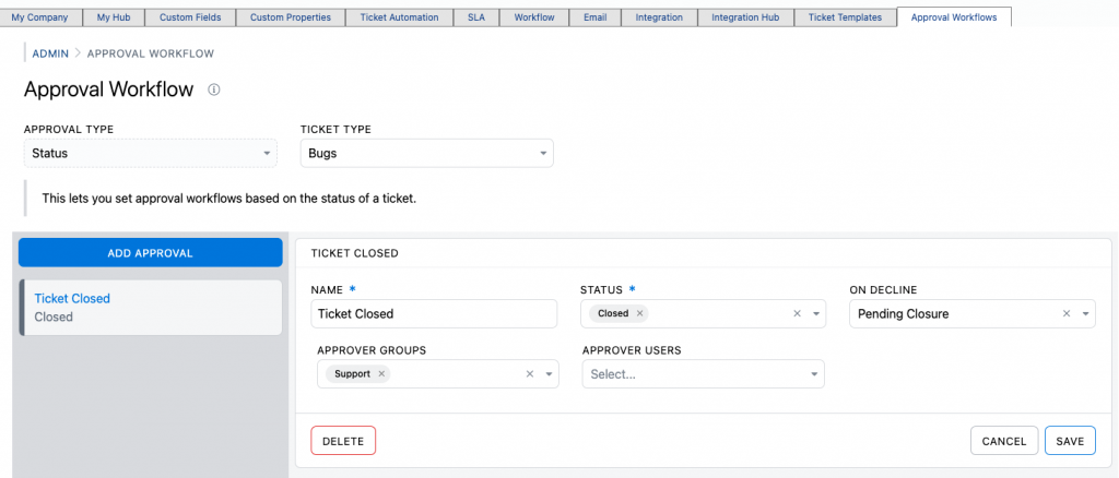Once an approval process is set, tickets will remain in their current status until approval is given to change. For example, tickets will not be moved into “closed” status until the approver accepts the request to close out the ticket. Administrators can indicate which users or user groups have the ability to approve status changes on the workflow within the organization.